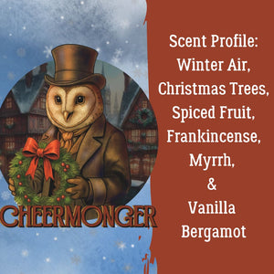 Cheermonger Scent Profile: Winter Air, Christmas Trees, Spiced Fruit, Frankincense, Myrrh & Vanilla Bergamot